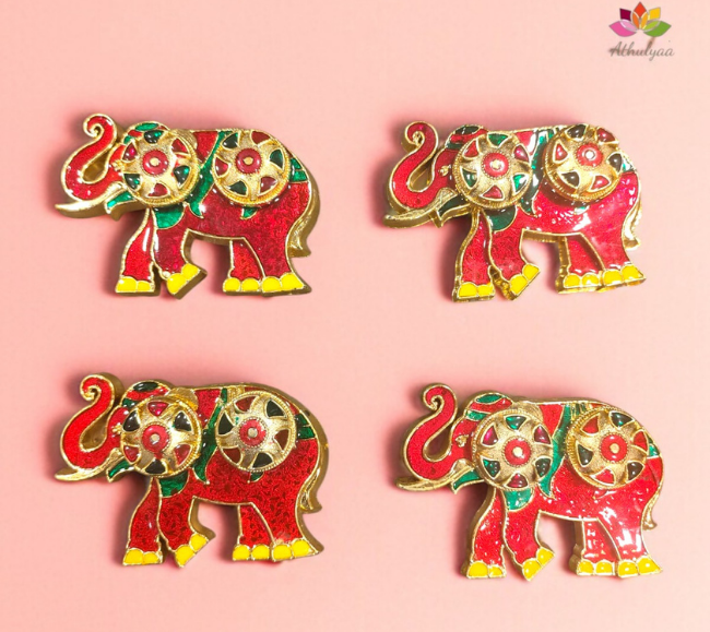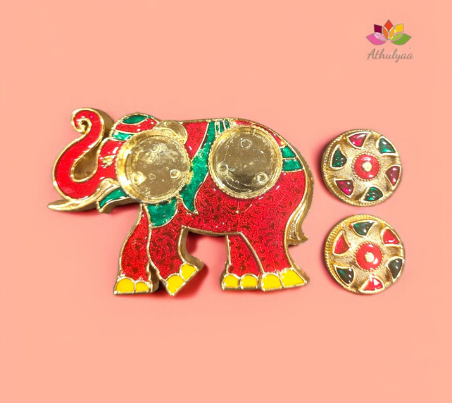 ✅Elephant kumkum box :The box is intricately shaped like an elephant, adorned with bright red and green enamel work, reflecting the vibrant and symbolic nature of Hindu culture. The elephant’s trunk curves gracefully, while its ears and body are detailed with colorful accents.
