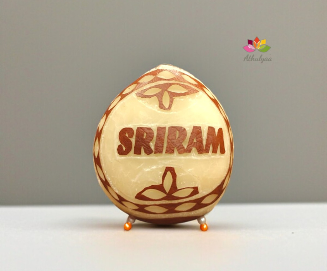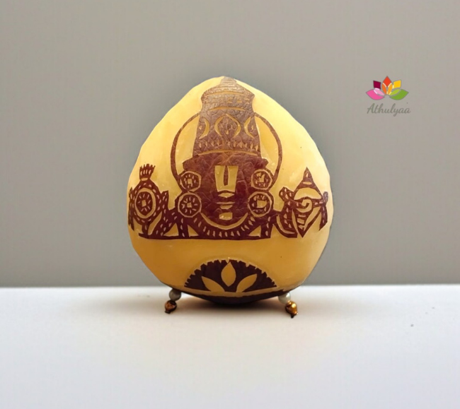 This beautifully handcrafted piece is made from a whole dry coconut, meticulously carved to showcase intricate traditional Indian motifs.
