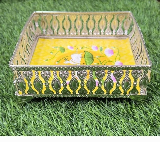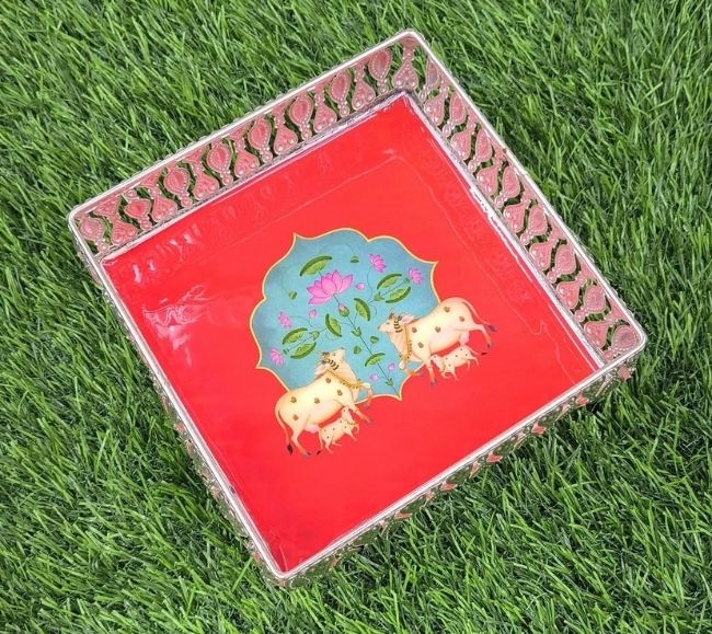 Enhance your home décor with this exquisite Square Pichwai Tray, designed to blend traditional art with modern craftsmanship. Made from high-quality German silver, this tray features intricate detailing and a smooth, polished finish that exudes elegance and charm.
