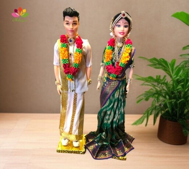 - Doll dressed in Tamil style wedding saree, Dhoti & shirt